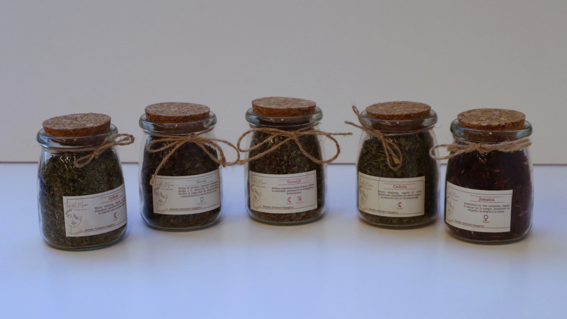 Tisana seleccionada rociada con mezclas de flores de Bach y esencias planetarias. Variedad de infusiones del Rancho El Maná en frasco de cristal. Contiene 40 gr de infusión.