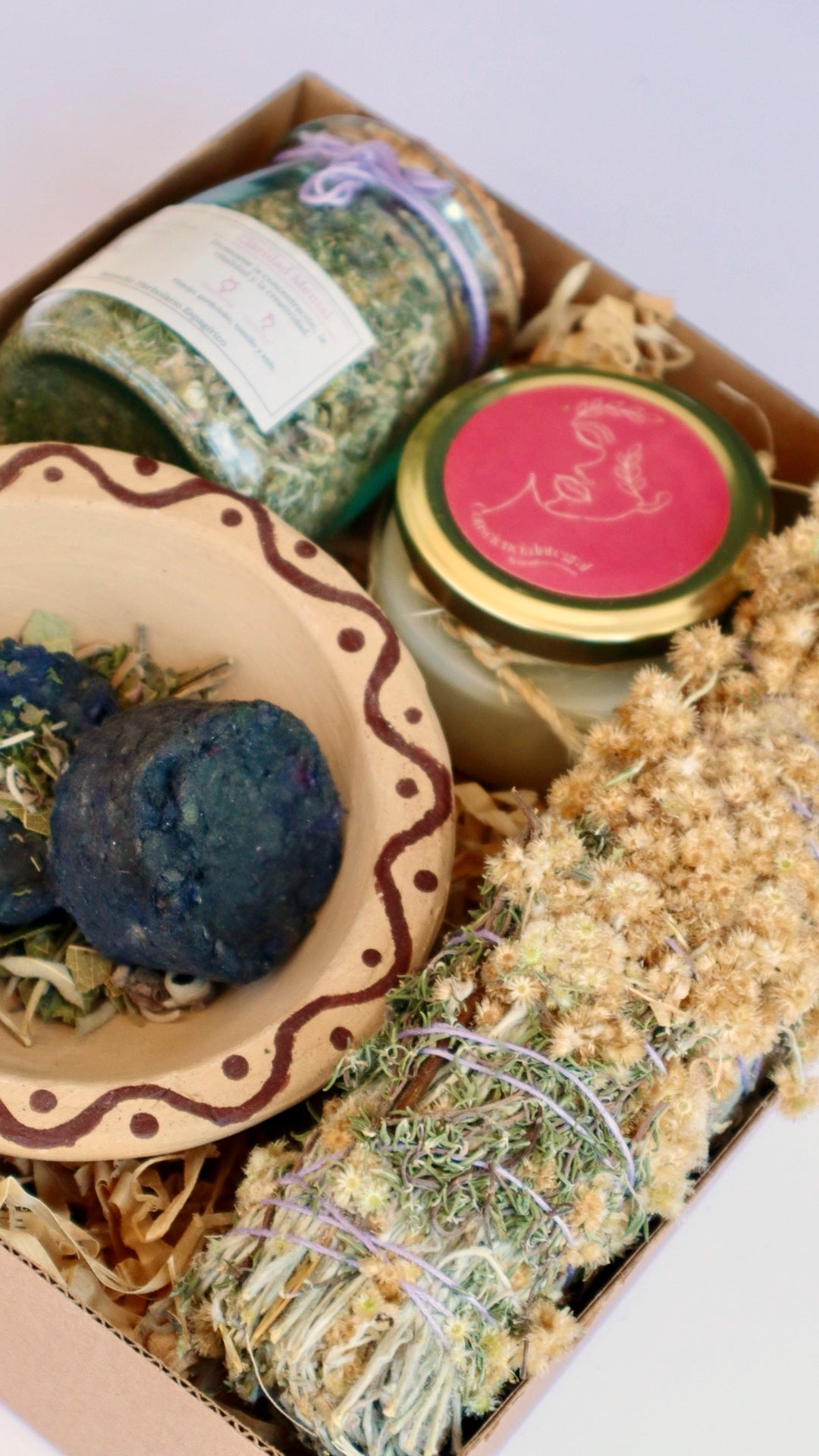 Incluyen: Sahumo Atadito, Sahumo Trituradito con 40 gr. de plantas, Jabón artesanal o 2 Velas, Plato quemador o Sahumerio y 2 Carbones vegetales.