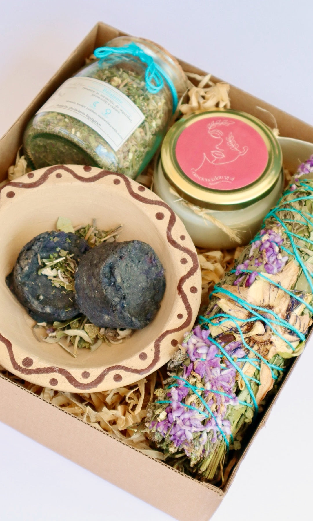 Incluyen: Sahumo Atadito, Sahumo Trituradito con 40 gr. de plantas, Jabón artesanal o 2 Velas, Plato quemador o Sahumerio y 2 Carbones vegetales.